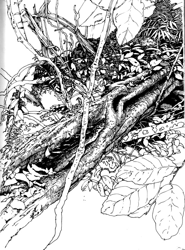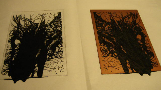 The last time I tried etching was during the Carter Administration, and technology has come a long way since then in the printmaking field. Today I tried solarplate etching for the first time, using one of my rainforest drawings. It wasn’t a total success but these things apparently take some trial and error. Here’s how it works: you have a metal plate with a polymer coating that’s sensitive to light. Place black lines over the polymer, using a transparent film with your artwork printed on it. Expose to the sun for, depending on how bright a day it is, a couple of minutes to many minutes. The polymer exposed to light hardens, and the polymer shielded from the light beneath the black lines stays soft and washes away with plain water and a soft brush. The washed-away lines are little furrows where the ink sits until it gets run through a press along with a piece of paper. Simple- you can try this at home, no need for acid baths or asphaltum grounds. Just the plate, the drawing and the sun.