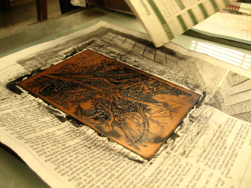 When you use the sun to make etchings, ideally you should do it on a sunny day. Today it snowed. All day. UV light will penetrate a snowstorm but it takes a much longer exposure to make a solarplate etching. Not only did we have to stand outside in the wind and snow and wait for this thing to etch, but we had to stand outside in the wind and snow for what seemed like an eternity. I’m sorry to tell you I forgot to bring the camera out there with me, because it was by far the funniest part of the day. The solarplate wasn’t the only thing being exposed to the elements. Artists must suffer for their art, but not generally not from hypothermia.