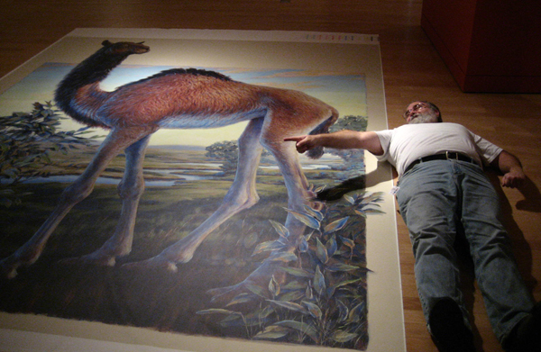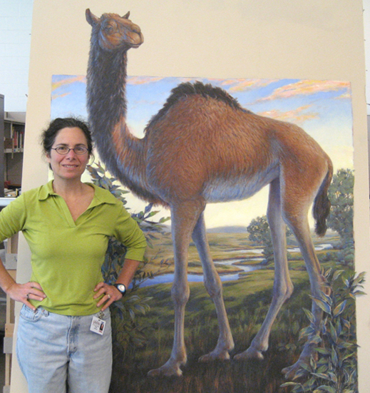 After spending about 6 weeks on a painting of Oklahoma’s Miocene-era giganto camel Megatylopus for Sam Noble Oklahoma Museum of Natural History’s Collecting Oklahoma Centennial exhibit, I was very happy to see the original artwork digitally and beautifully enlarged onto canvas, and have it look really really good. Every brush stroke is juicy, the colors are perfect, and that camel has a look in its eye that’s just down-home personable. What a thrill. Plus, it’s HUGE. As SNOMNH Media Specialist Mike McCarty said to me (with a nod to John Candy), “It blowed up real good”.