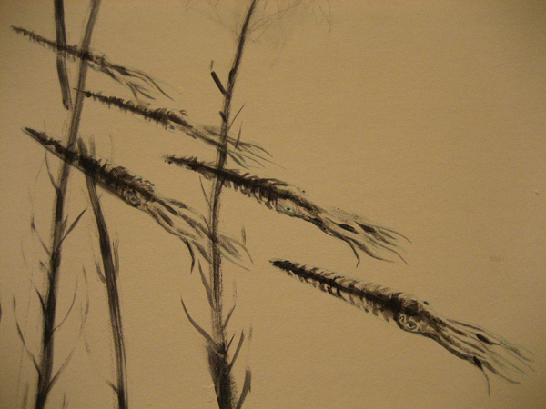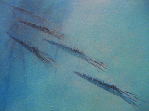 The Crinoid painting is coming along nicely. I’ve sketched in the background with neutral dark gray acrylic scumble and now I’ve added the critters, also in gray. My method for this was to print out the various elements to size and draw them onto the panel using a chalk transfer paper and a stylus. Actually, it’s a glass dip pen I bought in Italy. Works nicely, though, for the purpose at hand. The point isn’t sharp enough to scratch through paper, and it looks so darn pretty. I can see Leonardo using one of these to draw belemnites, too.