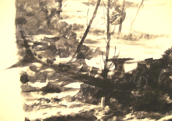 Stethacanthus and Goniatite, roughed in. The gray mix is burnt umber and ultramarine blue. The background is Titanium Buff Gesso.