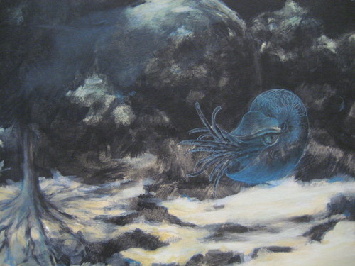 Well, at least it kept me warm on a cold day. I’m about to go watch Philadelphia Story for about the fifth time, so I’ll make this short. Here are a couple of pics of the Crinoid painting as it looked about 5pm today when I washed my brushes and called it a day.