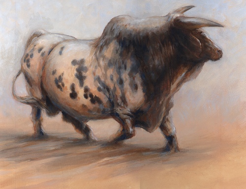The Rodeo Bull got the Photoshop treatment, followed by analog paint application (brushes and canvas). I knew something wasn’t right about it, but wasn’t sure what, and my studio isn’t big enough to step that far back (about 300 feet might do it). I scanned the canvas and opened the file as a jpeg.