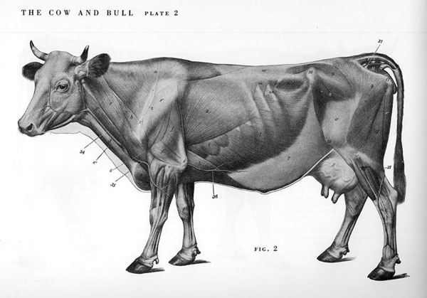 My Rodeo Bull finally appears to be finished- after I consulted my copy of Animal Anatomy for Artists (Ellenberger, Dover Publications, 1949), a wondrous book with spectacular pencil drawings of animals deconstructed in various stages all the way down to the skeleton. Since they are in lifelike poses, with a even a nice sparkle to the eyes, the drawings are a little eery.