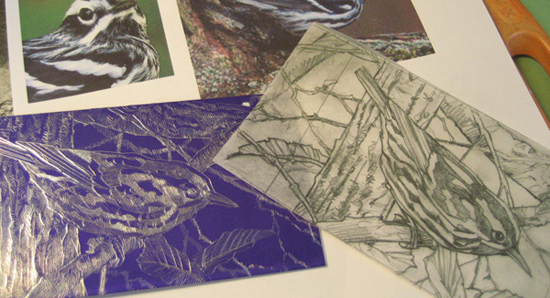 drypoing.jpgDrypoint etching of a black and white warbler with pencil drawing alongside.