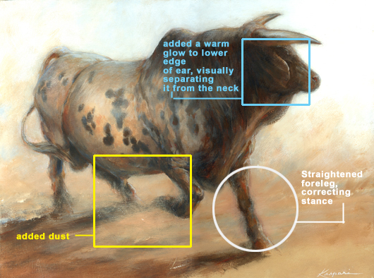 Okay, I’ve kept you all hanging in suspense long enough. Here’s what fixed the bull, and a big thank you to my art pals with the sharp eyes and good suggestions.