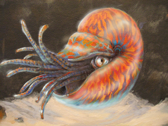 It is always a pleasure to come and check out your blog, I love your work. Your first picture “Octopus Inky Defense Strategy Confuses Moray Eel” is really cute, I got a good chuckle from that one, and your second painting “Nautilus-like goniatite floats through a Pennsylvanian-era sea” is beautiful. I live the rich orange and blues, and I think purple and green that is in its shell. Great work, thank you so much for sharing!