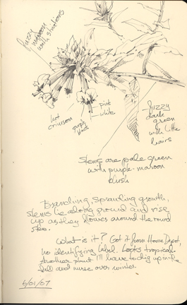 Everything here is growing and sprouting as only plants getting an inch or two of rain every few days can. My new hobby is pulling weeds, every morning on my hands and knees with a cup of coffee next to me. I keep tossing seeds out there and they keep coming up: nasturtiums, lettuce, cucumbers, marigolds, arugula, cosmos. This morning I took the sketchbook out and sat by a few plants where I could record some nice flowerings. Shrubby St. John’s Wort Hypericum frondosum is a nice native shrub with a good fuzzy yellow flower, and the cultivar I’ve got is called “Sunburst”. It has a bonsai look to the gnarled trunks and peeling bark, very handsome indeed. There’s a gorgeous low-slung flowering scuttelaria-like thing I got at Home Depot, unidentified by any label but it was imperative that I buy and plant three of them instantly; if anyone can tell what these are I’ll be interested. They look tropical, I think. The rain has made me ambitious.