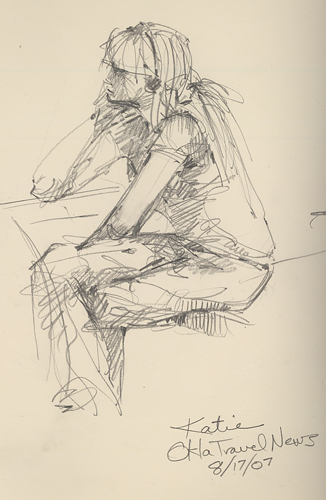 Did my first webcast today. It was done live from a studio at the Riverwind Casino just south of Norman, Oklahoma. I was on to promote my show at JRB Art at the Elms, and I was asked to bring along a sketchbook so they could interview me while I drew the foliage outside the casino. The “studio” is onstage in the casino lounge, with raging slot machine action in the background and constant warbling sound effects consistent with winning and not winning (you hate to use the word, “losing” in a casino, it’s so darned negative).