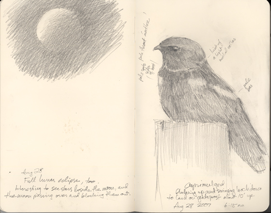 With the moon in totality, it was fascinating to watch stars come out all around it. How often do you see a full moon sliding over and occluding little stars? The bright disk became a dusky ball, a stone in the sky. As it moved down toward the horizon, the sky began to lighten and the first birds to sing. Field sparrows, trilling away in the tallgrass. That’s when I noticed a larger bird fluttering upwards by the gate, rising, flipping over and coming back down. I turned the scope to look at the top of the gatepost and there was a night bird of some sort. It was perched too horizontally for an owl, and was hawking prey. Every minute or so would go up to catch something, flaring rounded wings as it flipped around. As the day began to lighten I started to see more than its silhouette: two pale spots emerged, one on either side of the breast, and what looked like a thin pale crescent appeared across the throat. A wide pale bar was distinctly on the shoulder, and what looked like a lighter area on the back of the neck. The bill was tiny and curved, the eye big and black. I haven’t gotten to watch many nightjars (another name for goatsucker) actively hunting, and this one was alert, searching with rapid movements of its head, looking this way and that.
