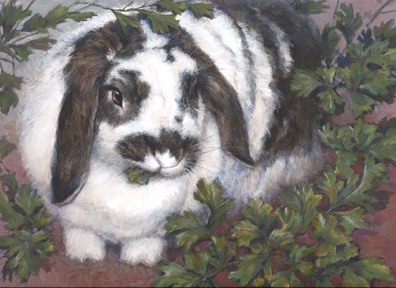 So I’m huddled upstairs, putting paint on a commission I’m calling Walt the Wabbit. Walt, recently deceased, was a big, sweet, gentle lop-eared bunny much cherished by my friend Konrad, who is at this moment in the stands at Owen Field watching OU beat Miami. I’m sure it’s utter pandemonium out there. In his portrait, Walt is surrounded with his favorite food, parsley. It’s a very quiet serene scene; a small rectangle of peace and meditation. Downstairs the Nebraska game is still up for grabs. I know I have some earplugs around here somewhere.