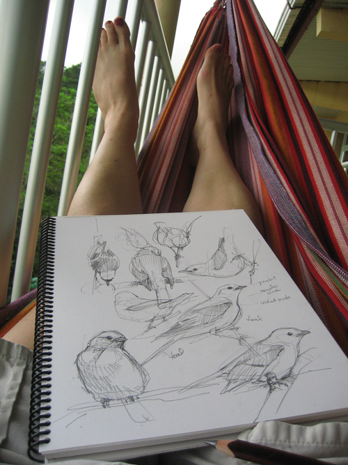 The finest way to draw–Bluegray tanagers sketched from a comfortable hammock on Barro Colorado Island, Panama. Right on the other side of that railing is a fruiting tree. Note the pink toenails- on the artist, not the bird. But where is my drink with the umbrella?