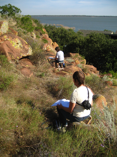 Stunningly rugged scenery and great weather added up to four fabulous days at the Oklahoma Art Institute’s fall session. The workshop was held in a beautiful stone-and-timber lodge, a jewel in the rough stone setting of Quartz Mountain State Park. Just north of Altus, Quartz Mountain is a pile of pink granite boulders, prickly pear cactus, post oak, juniper and hackberry trees beside a fine blue lake patrolled by white pelicans and osprey. I was teaching a course in field sketching and nature journaling, and my sixteen intrepid students were public school teachers from small towns and inner cities around Oklahoma. They were a dedicated bunch, ready for anything including clambering around rocks and drawing pictures. We had a blast.