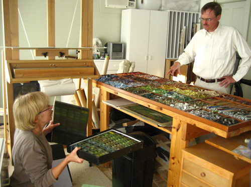 Barry Van Dusen (left) ponders the latest plein air canvas by Jim Coe (right)