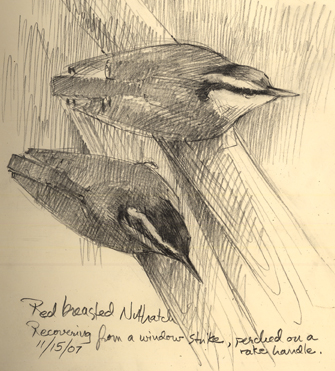 After a few minutes the nuthatch stopped panting and fluttered up to attach itself head downward to a wooden rake handle that leans against the wall. It held on weakly at first, but this is its natural position in life, pointing at the ground, not spraddled on it. I drew the nuthatch as it collected itself and finally, all at once, flew off . A joy to all of us except the cat.
