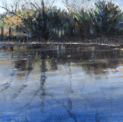 Here’s the latest- it’s #5 in the One Hundred Starts series. There’s a little pond next to our property. In twelve years I’ve never gone over there to paint (I’ve never hardly gone anywhere to paint), and in the last few months someone’s finally bought this orphaned property, it seems. While I was out there splatting paint on the canvas a red pickup rolled past, stopped, and backed up so the people inside could give gave me a long look. I waved, they waved and drove on. No one kicked me out. It’s a nice spot to paint- I saw at least five more possible paintings in the morning light. Who knows how many will be available at Happy Hour?