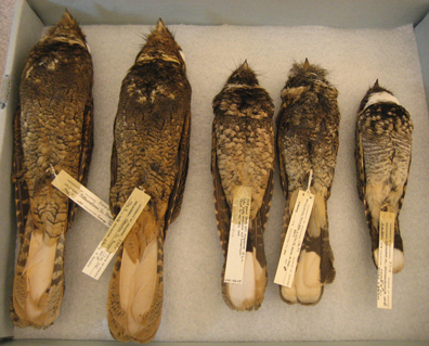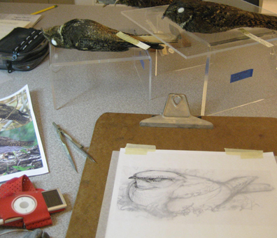 At the moment I’m working on a goatsucker identification plate, which allows me time at the Museum, a place I love to hang out. The bird skin collection is awesome, and it’s a privilege to get to use it. I’m working from skins of Chuckwill’s widow, Whippoorwill, and Common Poorwill. One of the unique characteristics of the Bird Range (the collection’s nick-name) is that many of the specimens were collected and prepared by none other than George M. Sutton, one of the deans of American bird art, and a hero of mine. To study closely and draw from a beautifully prepared Chuckwill’s widow, and according to the tag, even collected a few miles from your house by none other than your hero is a thrill hard to beat.
