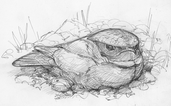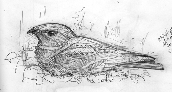 First came the rough sketches, working from photos and memory (I’ve seen Chucks and Poorwills but haven’t been lucky enough to see a Whip).