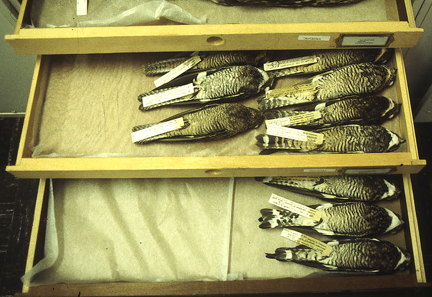 These were submitted for approval. Next, I went to the museum’s bird collection, where Amanda let me pick out the skins, and very obligingly allowed me to set up a small studio for a few days in the collection room, with drawing board, risers to bring the skins up near eye level, my watercolor kit, and a daylight lamp. Using a calipers and ruler, I turned the rough sketches into measured drawings.