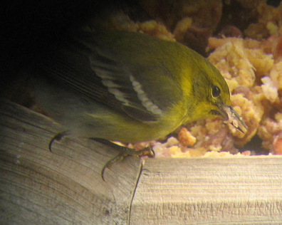 Pine Warbler sucking down suet dough from my backyard feeder