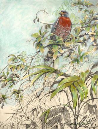 Double-toothed Kite pastel and graphite, 20″x26″. Drawn from life amid the light-gap vegetation of Barro Colorado Island, where it perched, posed, then pounced on a lizard climbing a tree trunk. I like the piece but there was always something amiss with the drawing of the breast and barring. Too flat. The tail has problems, too. Much to address here.