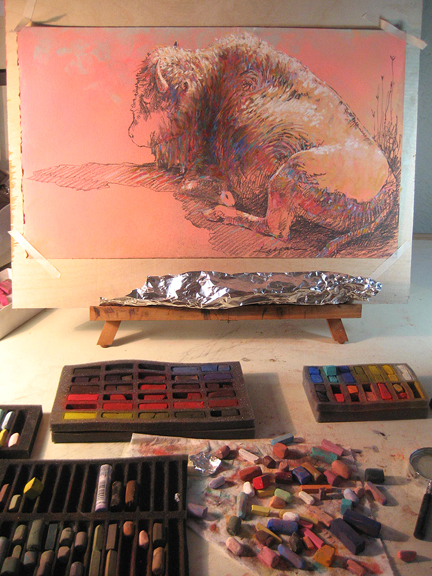 About the bison picture at the top of this post: the background was an experiment that turned out very well. I’ve been hearing all about pastel washes: you draw on the pastel and “wash” it with turpentine or turpenoid, in my case. Works real nice. You use as many colors as you want in the dry medium, get the colors where they look good, then brush on the turp, mooshing up and dissolving all the colors , smushing them around and into each other. When it all dries you can go over it again with more dry pastel. And turp it some more. As far as I know there’s no end to it. The pastel sinks into the tooth of the paper and stays there for good (I’m using Rives BFK heavyweight). Part of the beauty is that the paper doesn’t buckle, dries fast and flat when you saturate it with turpentine as opposed to water. Just don’t light a match while you’re waiting for it to dry, and use some ventilation, for God’s sake.