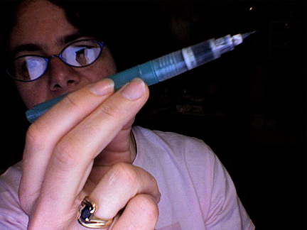 • 1 waterbrush- a plastic handle contains water, which is squeezed into the bristles of the brush at the end. Ingenious. Has a cap to keep it from leaking. A gift from my friend Becky, where she found it only she can say;
