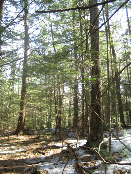 Ensconced in the beautiful Harvard Forest in Petersham, Massachusetts, I can safely say that our backyard here is fabulous- hemlocks and hardwoods as far as the eye can see, snowmelt streaming through mossy banks and crashing over rocks, the forest floor a cushy mat of soft compressed leaves, pleasing to walk on. Round mossy boulders beckon the contemplative sitter with perfect butt comfort, and the wind whipping the high treetops like masts on stormy seas only barely whispers down below on the forest floor. Nirvana.