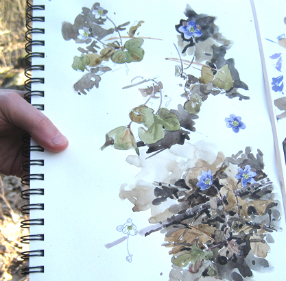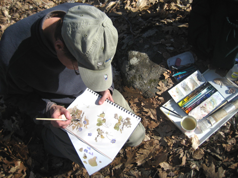 Last week the premier artist Barry Van Dusen and I hiked and sketched the Swift River Reservation just south of Petersham, a delightful excursion for a sunny afternoon. The trees are still free of foliage, but down on the sunlit forest floor we found a wee tiny blooming flower, Hepatica nobilis, emerging and flowering before the spreading canopy can throw it down into the deep dark well of summer shade. While a grand twisted sugar maple attracted my eye, Barry got down practically on his hands and knees to paint the hepatica. I tried to capture the whole gargantuan specimen on my biggest sheet of paper and and he was quietly drawing and painting the little hepatica, making the most perfect work of watercolor beauty in miniature. I polished off the maple and moved on to a great heap of huge granite boulders, a colossal monument to the great retreating glaciers. Barry stayed small. And perfectly awesome.
