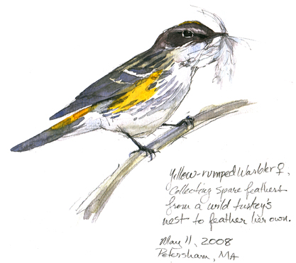 Yellow rumped female warbler gathering nesting material from a turkey’s nest. Watercolor on Canson drawing paper. Drawn through binoculars. 5/11/08