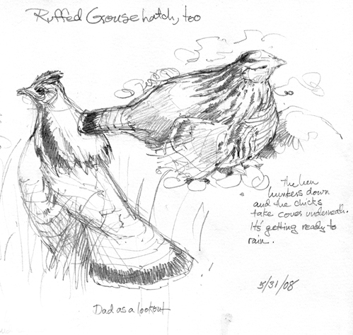 I called to Mike to come up and look-it was his lifer ruffed grouse, as it happened-and while I tried to help him find the nearly invisible bird crouching in the maple leaves, he said “no, it’s out in the open”. A second bird had trotted to the opposite edge of the meadow and stood like a king in full sun, his regal cape of hackles around his shoulders rising and falling in agitation along with the small crest on his head. I grabbed a sketchbook and drew fast.