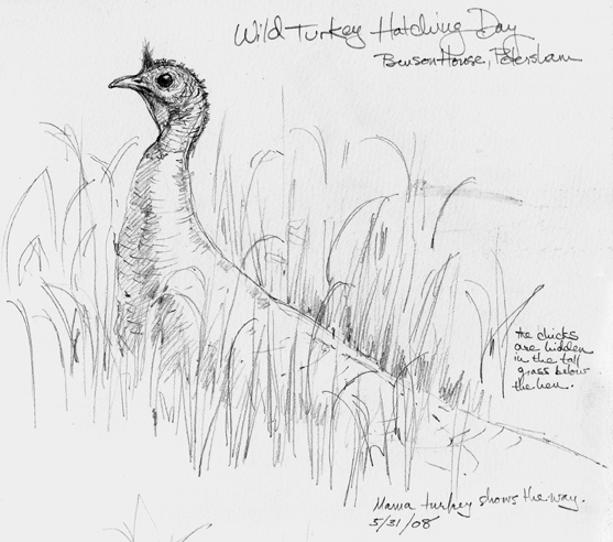The sound of chuck-chuck-chuck turned out to be mother turkey calling softly to her just-hatched chicks as she led them slowly through the meadow downhill to the woods. I had just enough time to catch a look at little brown-striped fuzzy balls as they tumbled over the bare ground, before they vanished into the tall grass. After that, all I could see was the hen turkey pushing through the tall grass like the Queen Mary steaming through high green seas. Grass stems twitched and waggled comically around her, indicating the chicks far below following their titanic mother’s ankles.