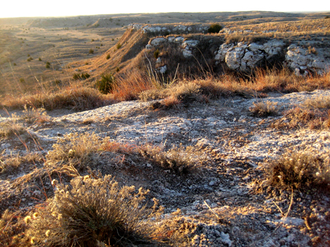 bluffsIt’s a beautiful, peaceful place. Good for listening to the Western meadowlarks singing far below the bluffs where you stand watching the sun rise and shivering in the February wind. Where deer bounce away with their white tails flipped up as Sue’s pickup truck bounces along the rutted dirt road between the rolling swells of shortgrass prairie hills. Where the threatened lesser prairie chickens still dance on their leks in the spring as they have for eons.