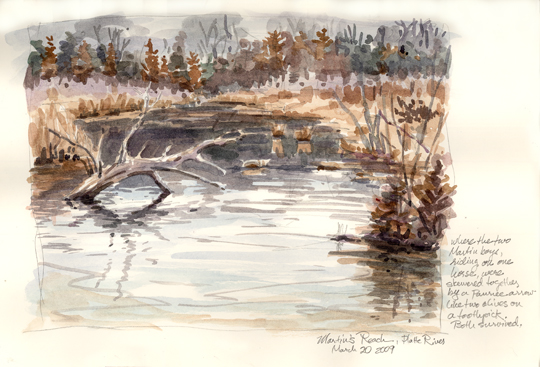 Drawn through the fieldscope: Sandhill cranes landing on the river; drinking; agressive posture at the bottom left.