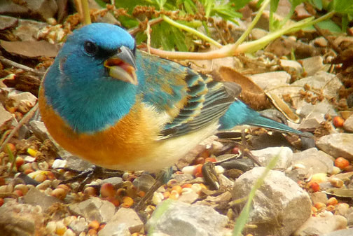 I feed screened corn on the ground in an open spot in my yard and have seen Lazuli buntings here in central oklahoma. Indigo buntings,cadinals, and doves love this feeding method.