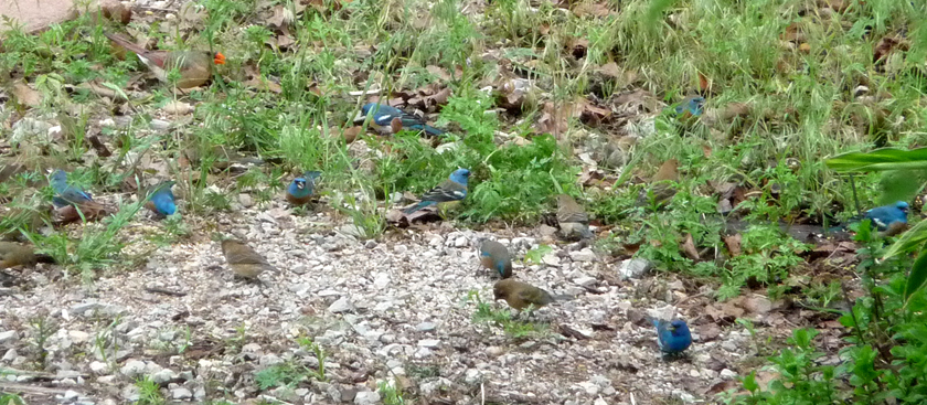 With this bunting influx I almost hate to leave. There’s getting to be quite a flock. The males (9 of them as of yesterday) have begun singing to the females (4 at least). Is breeding possible in these parts? Lazuli buntings are very unusual around Central Oklahoma. They are more of a western bird, and a scarce spring migrant, nearly rare. They are joining the indigos and painteds, our usual bunch who breed here. The male indigos seem unnerved by the lazulis and are staying clear of them. The females seem to be more intrigued.