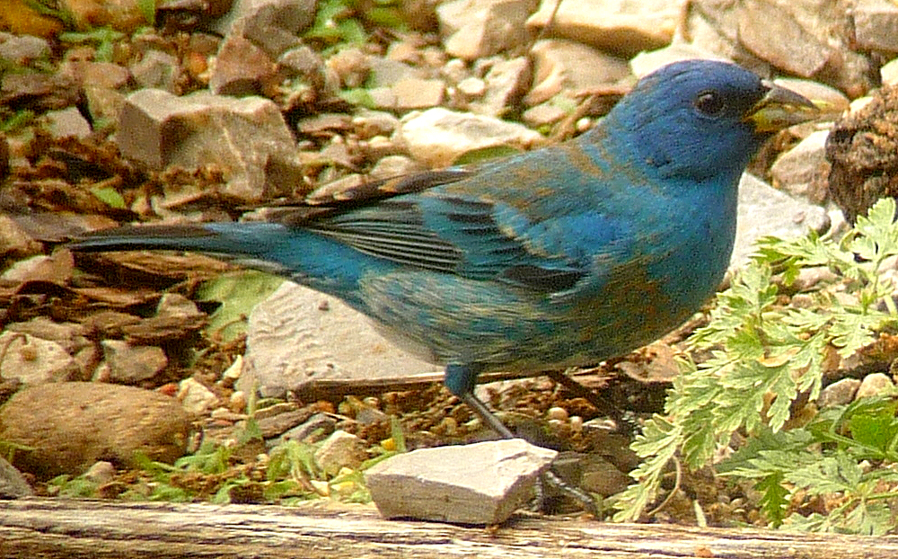 Yikes! You lost a lazuli bunting last year (found it on the porch, a possible casualty of plate glass). Having only seen an indigo in person, I wrongly thought it very, very…bright. The chairs, by the way, are fabulous. The garden is excellent. I see no giant ragweed. Darn.
