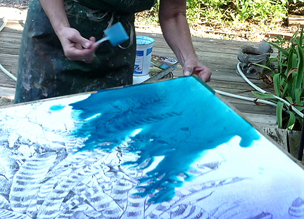 The water cure. There’s a shower curtain over the patio table to puddle water on. The idea is to wash off the loose graphite and get the paper REALLY well soaked.