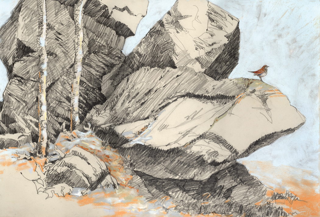 19th Century Quarry with Hermit Thrush, 22" x 15" pastel and graphite on paper, drawn plein air in the Harvard Forest. Now on display in Birds in Art through November 15