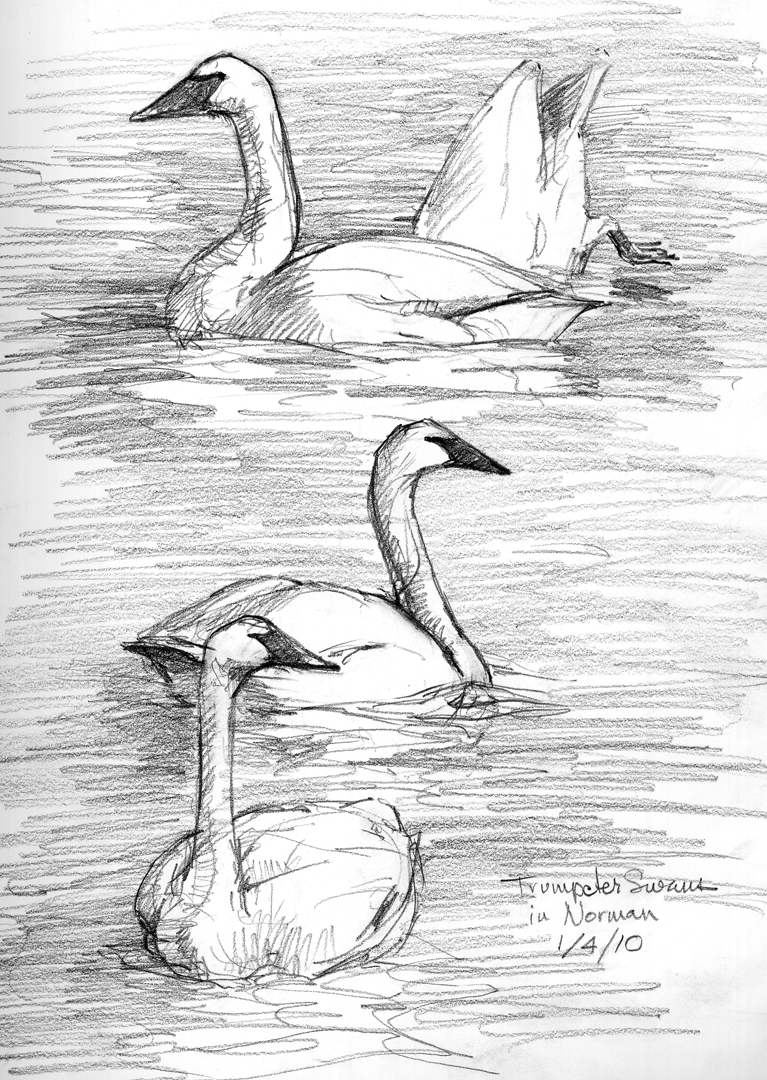 Trumpeter swans grace the Oklahoma waters. Drawn today in Norman.