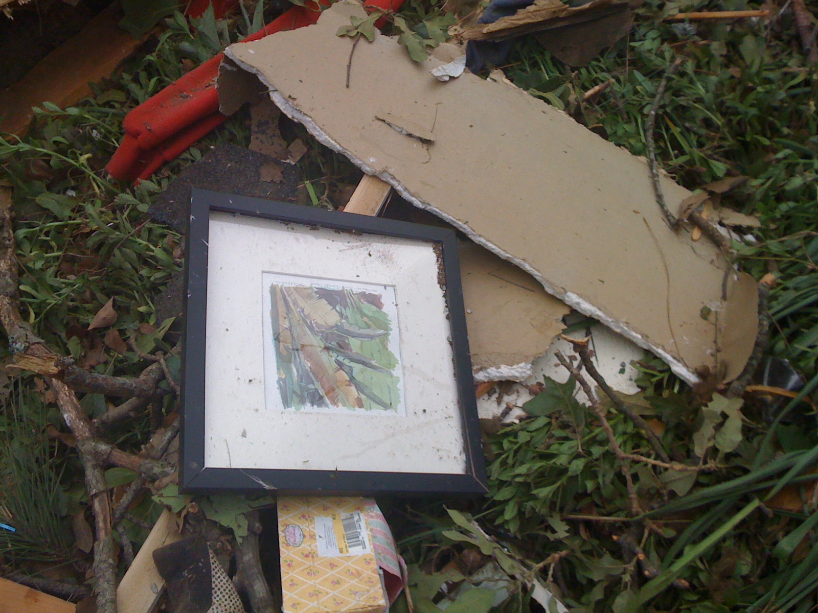 On Monday afternoon, Mike was baking bagels and I was upstairs placing an order for some Rives BFK, my favorite drawing paper. Our weather radio had been going off all day long, watches and warnings. The sky was strange: a dirty dark brown cloud cover with gray overtones. It was hot and sticky. The trees were full of warblers and a gray catbird hit the window. Then we got the tornado warning. A big one was coming our way, would probably miss us, but just to play it safe we took to the shelter, taking Gizmo with us (the only injuries I suffered were from a pissed off cat). I took my purse and a flashlight; Mike took his Kindle, God knows why (I guess he wanted to catch up on his reading). We weren’t down there 5 minutes before it hit.
