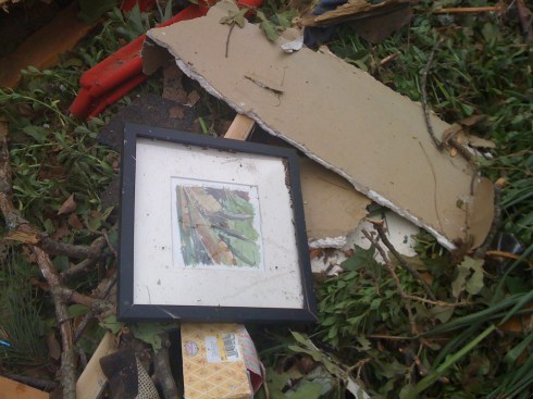 Debby: All morning I’ve been daydreaming that I run to that pile of stuff behind you in the picture and start searching for the great pictures and drawings. First I find some of your priceless notebooks, opened and paged through by the wind, but otherwise in good condition. And digging further I find a cupboard–the one with the best drawings–and they are OK! They survived! Then that woman with her back to the camera comes running with another notebook she found two hundred yards out. Maybe it’s not so total. Could it be? My heart goes out to you and Mike. A hug from 100swallows.