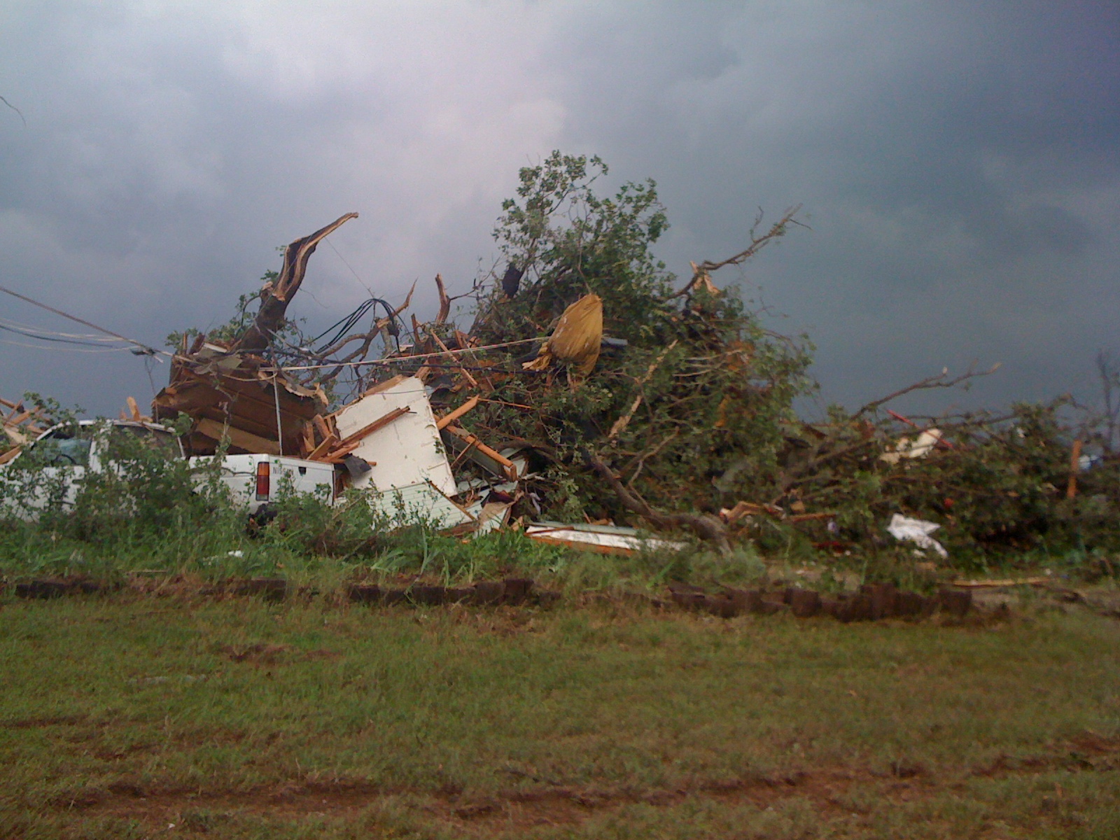 This is the backside of the storm, heading east. The red streak in the foreground is paint and shows the path of the tornado; a paint can was sitting on the garage floor moments before the garage exploded and blew away. Our once-beautiful forest is flattened and littered with debris.