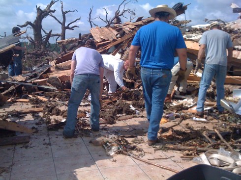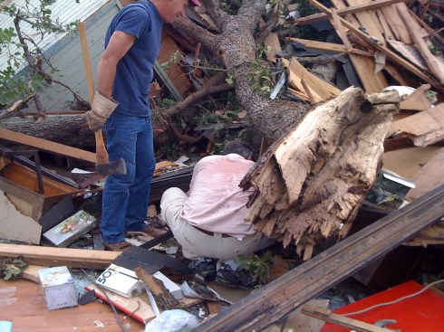 In the afternoon we heard residents were being let back in. We got a convoy of helpers and roared out to the sheriff’s checkpoint, where we met our insurance adjusters. They had inspected the debris, declaring our house a total loss; their eyes widened when we said we’d been home when the tornado hit. Our convoy moved slowly down the road and onward to tackle the huge task that lay ahead.