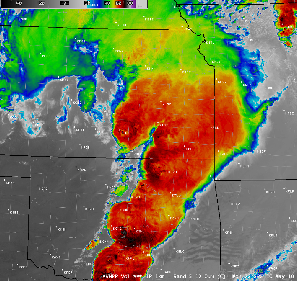A large-scale IR view on May 10, 2010 at 5:32 PM CDT showing the cluster of very cold IR cloud top temperatures (as cold as -84 C, purple enhancement) that a short time earlier was likely associated with the reports of a couple of tornadoes and hail of 4.00 and 3.75-inch in diameter in the Norman and Tinker AFB areas. Image credit: NWS Norman/CIMSS