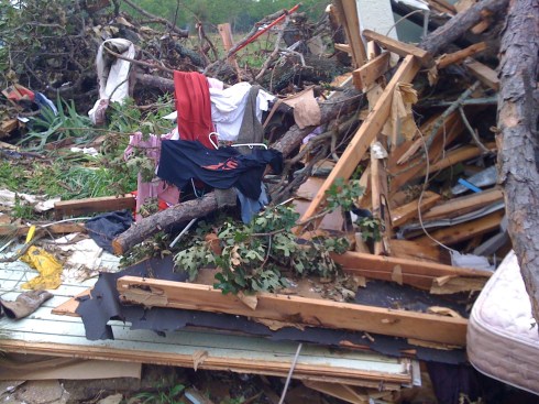 The EF3 converged with a second, smaller one right behind our house. The two may have interacted with the EF4 in some way but it’s still unclear if they did. Our neighbors Ken and Wanda stood on their front porch and watched the two funnels twist together, taking this as their cue to seek cover. They never saw the monster coming from the west; by the time they were in their closet it roared past their house, crossing the road and claiming ours. Ken and Wanda were shaken but unhurt. Their home had lost not much more than roof shingles.