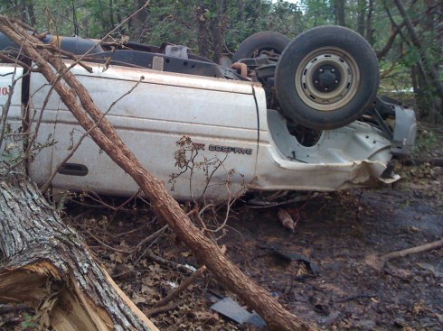 Another tornado, an EF3 (I think) that had just taken out the Country Boy Grocery and Gas Station, arrived from the south. The Country Boy was (and will be again, I hope) a small supermarket serving the needs of the folks of the Little Axe region, including us. The customers and employees crowded into the beer cooler as the store was demolished by the twister. A few days later I found a completely flattened Dodge Ram truck, wheels up, in our woods. The tornado carried it nearly a mile before dropping it  (and thankfully, no one was in it at the time). On the ground beside the truck is a torn-off gas nozzle; it was no doubt being gassed up at the moment of departure. Steel beams from the gas station are twisted like pretzels all around it and one has skewered the truck (yes, it’s still there. Will someone please get their truck?).