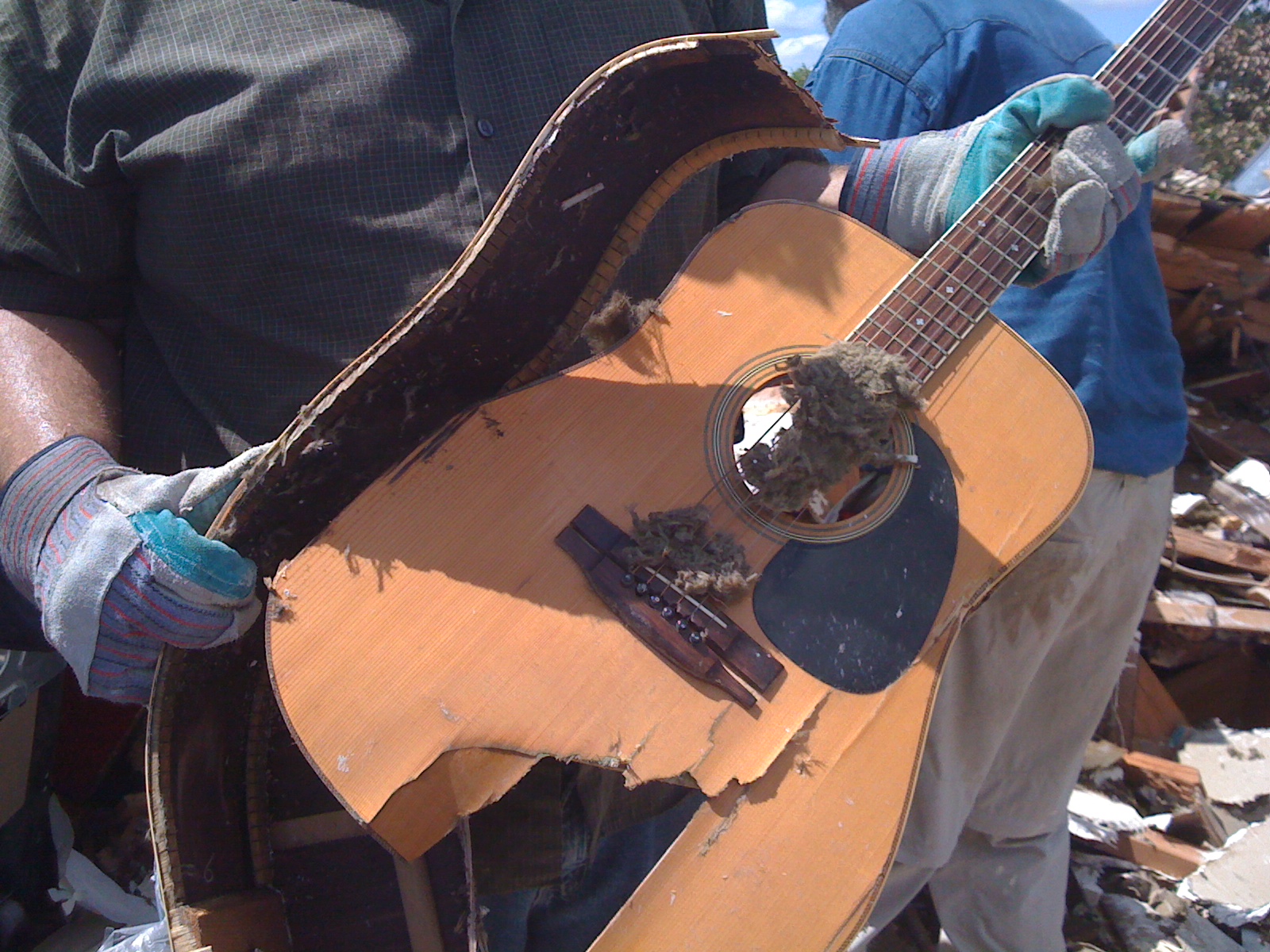 A 30-year old guitar bites the dust. The sound hole is filled with tornado grit and fiberglass insulation. P.S.: it was a Martin D-35 copy, not the Real Deal, but it was a very good instrument up until the last moment.
