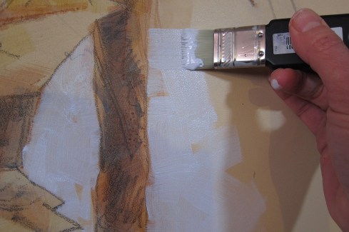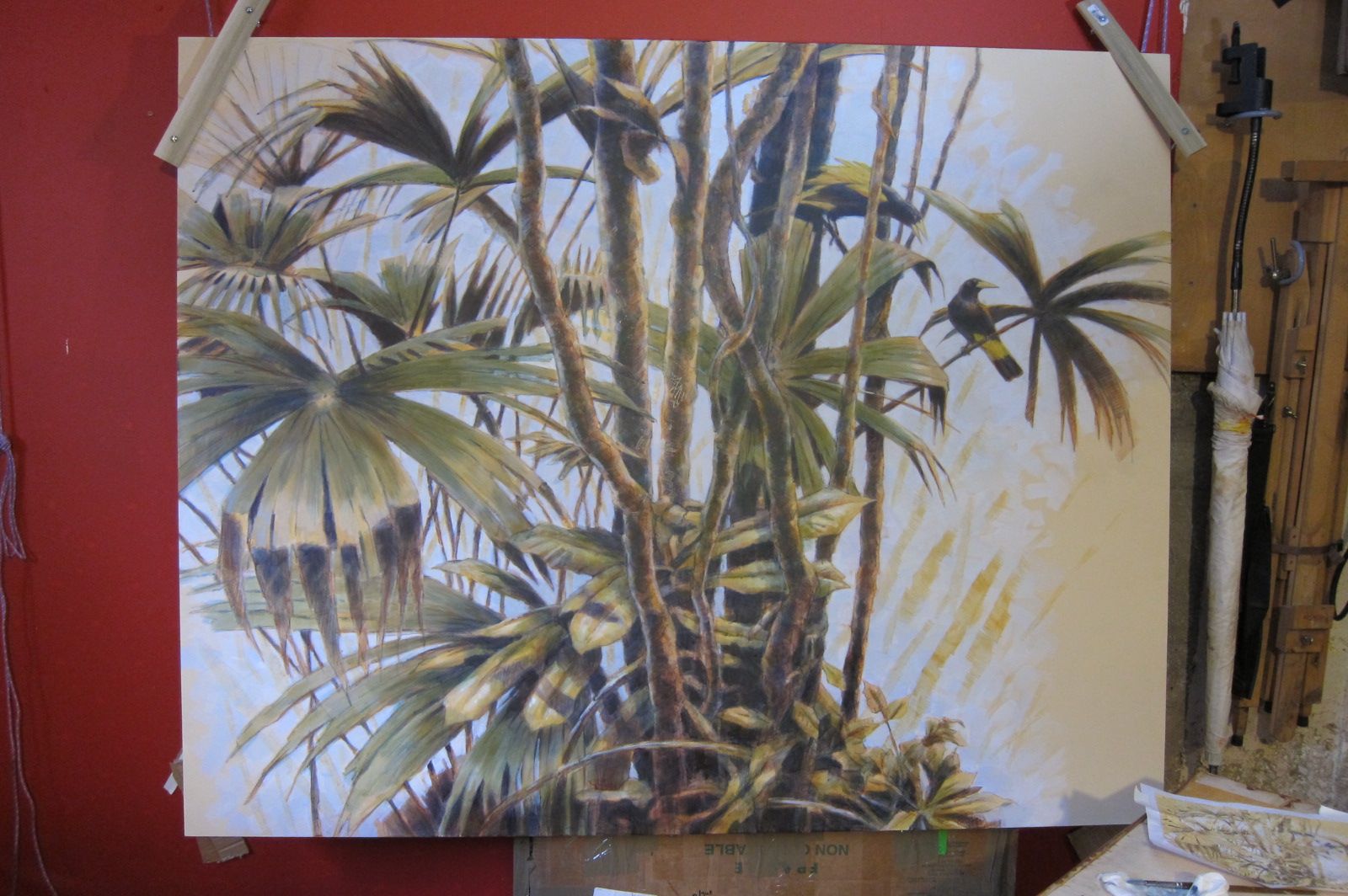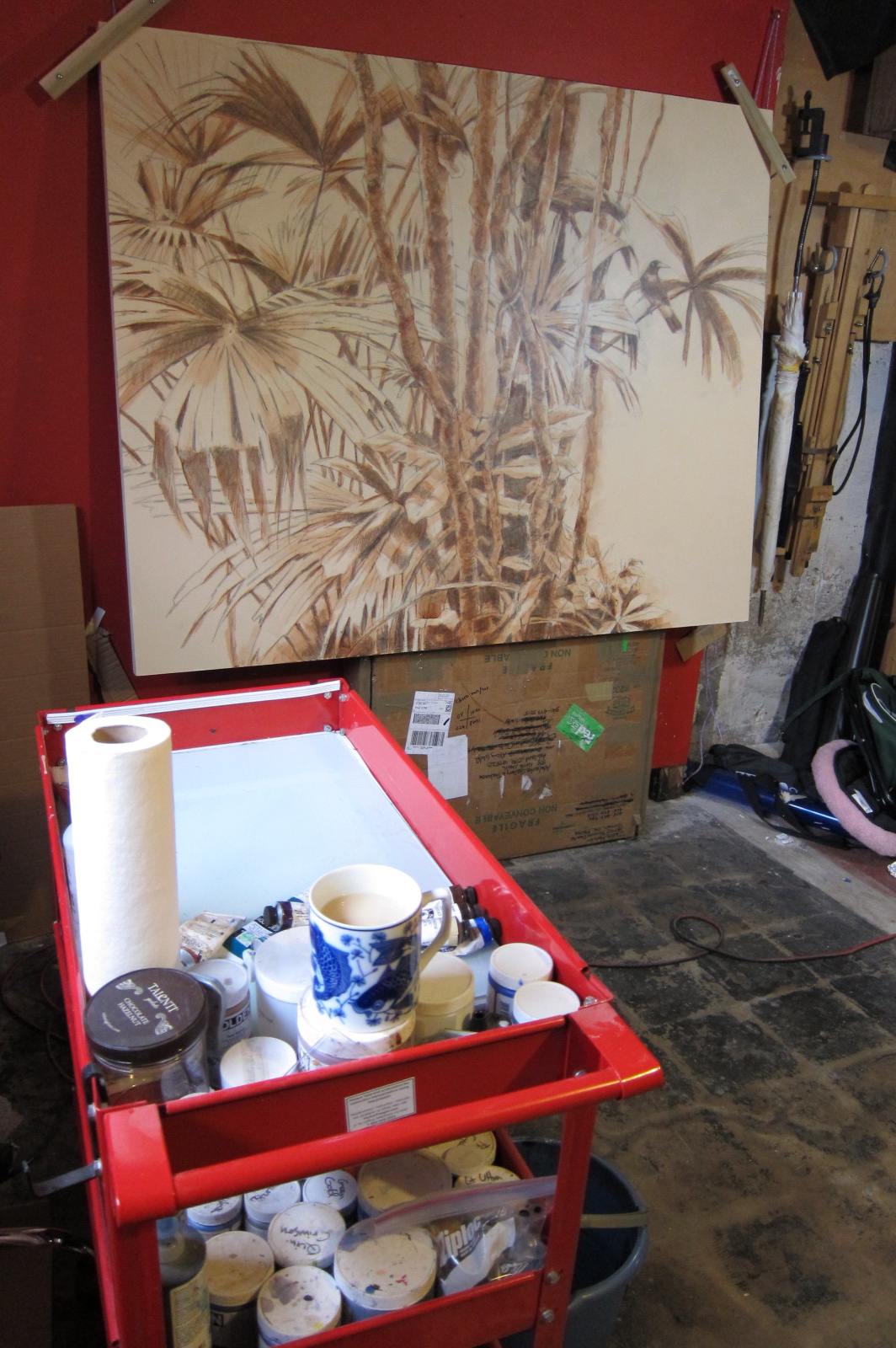 The temperature this week in my (unheated) basement studio hovered slightly above freezing. I could paint for about an hour before my toes dropped off, to be taken upstairs, thawed out and screwed back on. Going anywhere in this mess was out of the question; roads were icy, snow blew sideways and starlings huddled against the side of the house like whinging orphans in a Dickens novel. I baked ginger-bread men, popped popcorn and made hot tea when I wasn’t running downstairs, brushing on paint and returning upstairs to warm up. The painting is moving forward slowly but surely. I am breathing tropical air in my very active imagination as I push this baby into being.