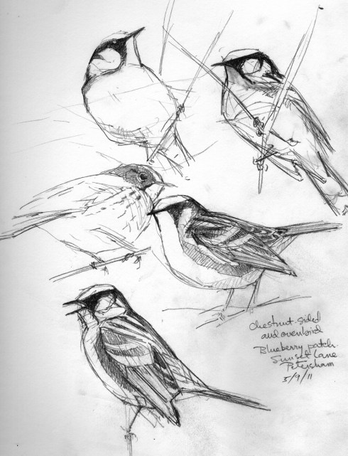 I hope they eat blackflies. Two male chestnut sided warblers competing for a small but productive spot of territory in a scrubby, marshy corner of Petersham gave me some good closeup views, which I took advantage of, sketchwise.
